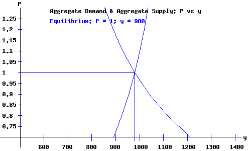 When P = 1, the equilibrium demand equilibrium occurs with a demand for product of y = 980, at a rate of interest r = 3.35.