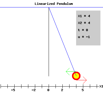 The objective is to use the control u(t) to bring the pendulum to rest as quickly as possible. The intuitive idea is to push or pull (green arrow) against the movement (red arrow) of the pendulum, resisting its momentum. However, the minimum time solution pushes with the momentum for short periods of time. The animated image below shows how this works. (Wait a few seconds and it will repeat.)