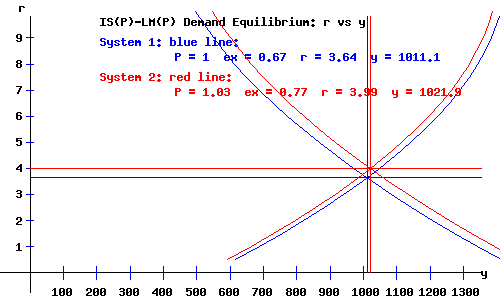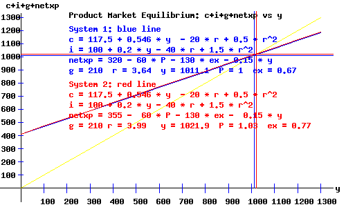 System 2 (in red): you set the values of the price level, the exchange rate, and the parameters of the net export function. Initially, I set the price level P = 1.03 and the rate of exchange ex = 0.77.  I also shifted the net export function upwards to reflect recent changes in world trade patterns.