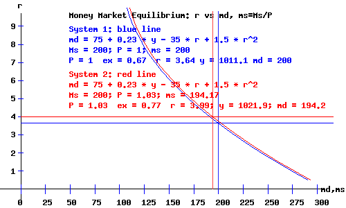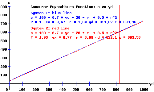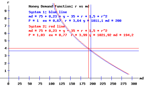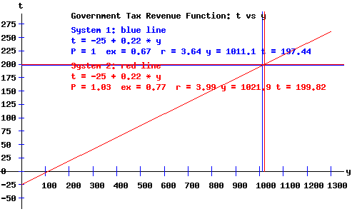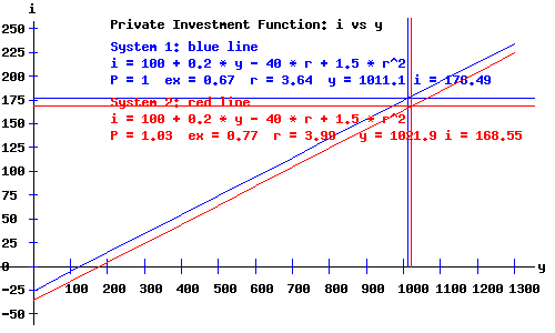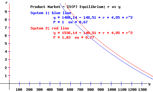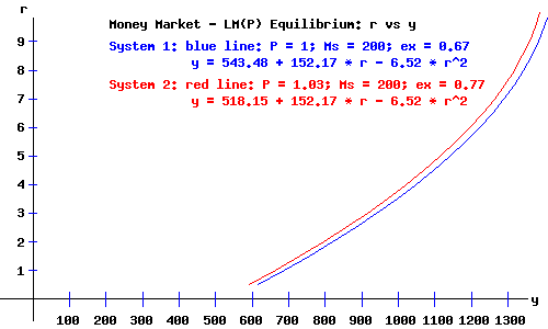 System 1 (in blue): the parameters of the macroeconomics functions reflect the average values of the macroeconomics aggregates of the Canadian economy during the years of 2001 - 2003.  Price level P = 1 and the rate of exchange ex = 0.67.