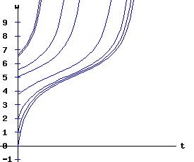 The next diagram illustrates some solution curves, x(t), for various values of the beginning population x0, an equilibrium population of xe = 30, and a growth rate k = .15.